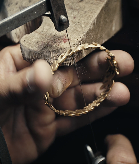 Crafted from 18k yellow gold, this sculptural cuff features 110 diamonds—each handset—totaling 1.1 carats. The gently curved silhouette makes it remarkably wearable despite its bold presence.